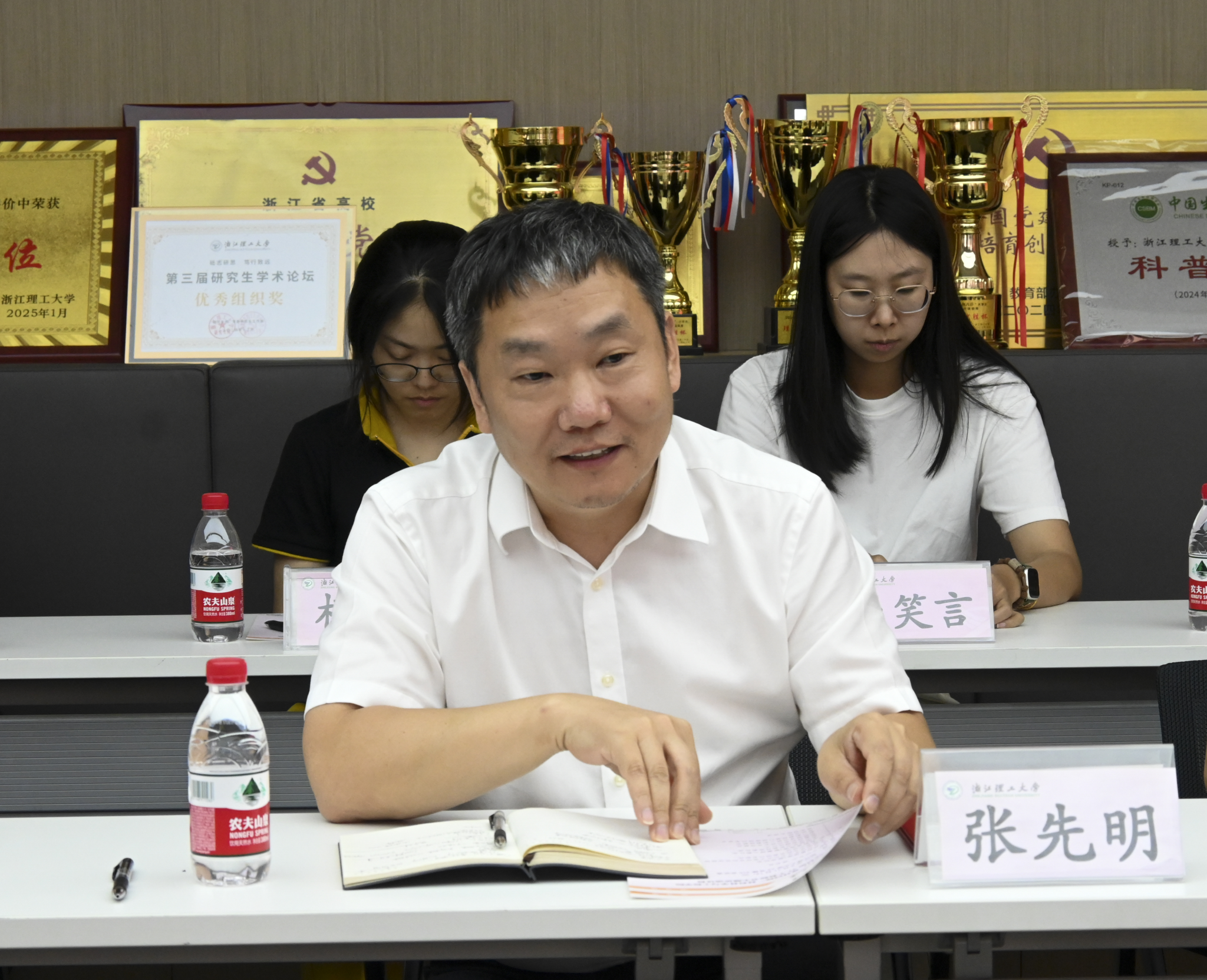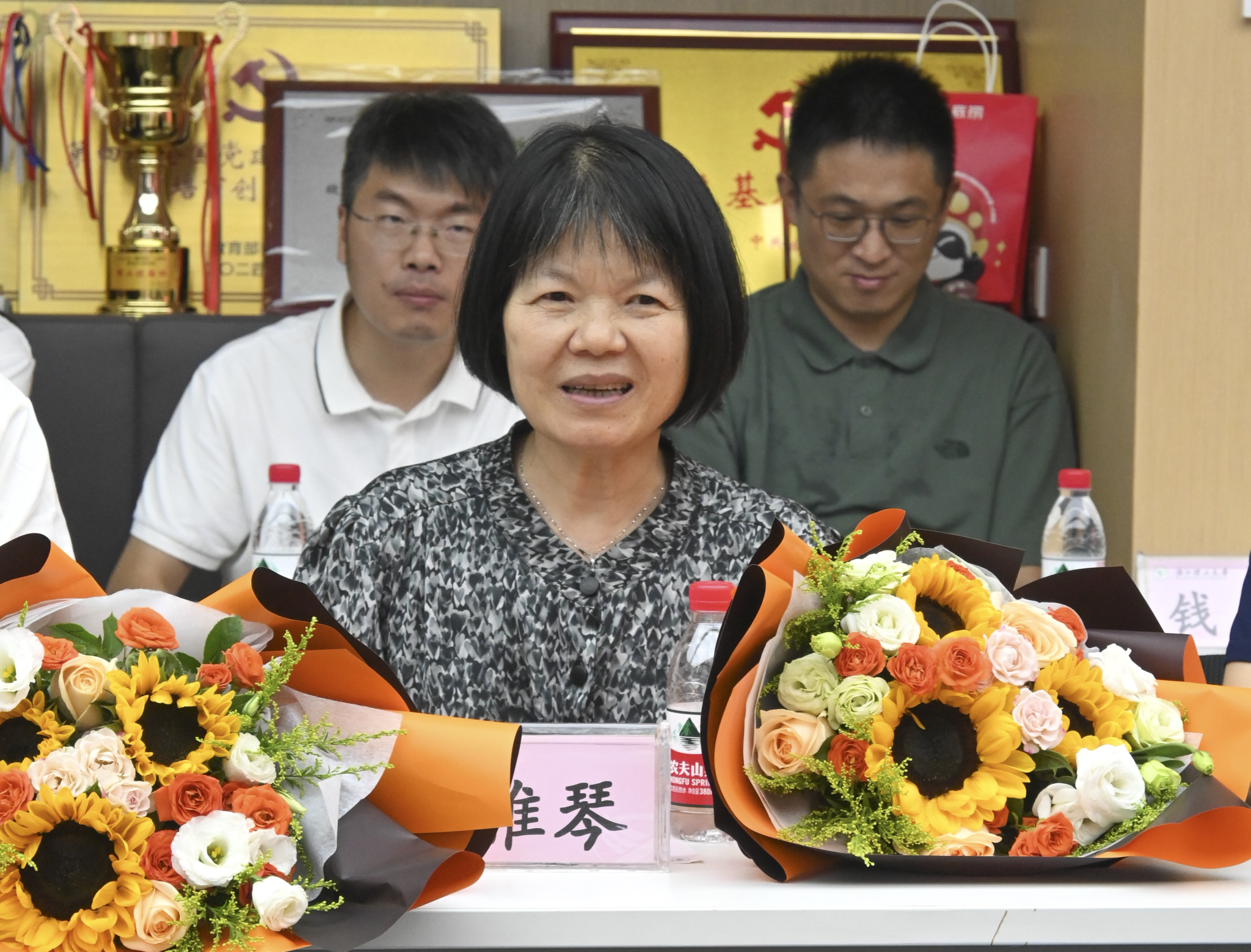 在“材料赞扬您”表彰环节,学院对2025年度在党务工作、教育教学、科研创新等方面取得突出成绩的教师代表予以表彰。仰滢、张先明为获奖教师代表献花,感谢他们为学院发展作出的卓越贡献。