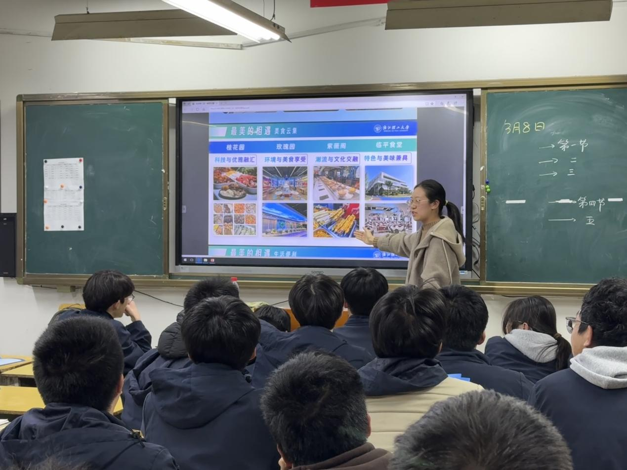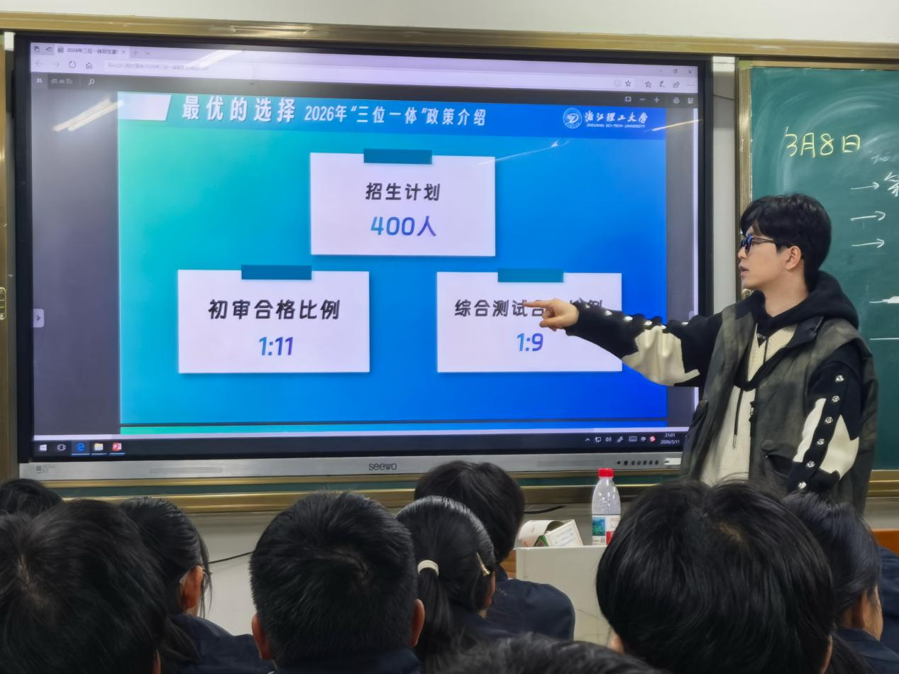 宣讲会上,夏青首先向在场师生介绍了浙江理工大学的百年历史文脉,通过展现学校的高水平教学科研平台、优势学科成果以及雄厚的师资力量,让在场学生感受到了学校为学生成长成才所提供的坚实保障;孔泽涛结合学校2026年“三位一体”综合评价招生章程,围绕“三位一体”招生政策、录取规则、专业设置等内容进行了详细解读,让学生对招生政策有了清晰、全面的认知;陈瑜结合自身学习生活经历,为学弟学妹们分享了大学生活的成长感悟,耐心解答了大家关于日常生活、专业学习、社团活动等方面的疑问,激发了学生对大学生活的向往。